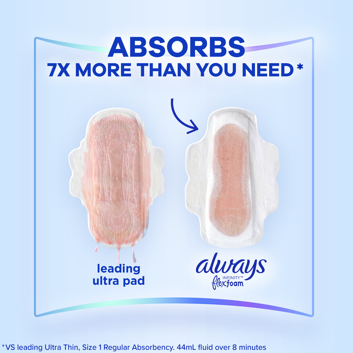 Always Infinity with FlexFoam Period Pads (with wings) are thin and flexible, featuring a dry top layer so that your pad moves with you, not against you. Experience up to zero feel protection, with form-fitting grooves that conform and mold to your body shape. Made with foam, not fluff, that flexes to your body, these pads can absorb 7X more than you need. The breathable top layer and super absorbent holes keep you dry and comfortable throughout the day.With Always Infinity with FlexFoam period pads, you can enjoy the confidence of up to zero leaks, zero feel, and zero bunching, allowing you to go about your day worry-free.